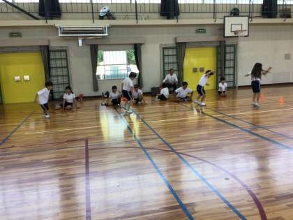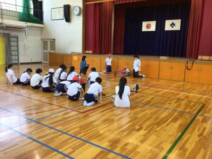 体育館での種目を行いました。立ち幅跳び、長座体前屈、反復横跳びに取り組みました。1年生は初めての立ち幅跳びでしたが、上手に跳びましたね。