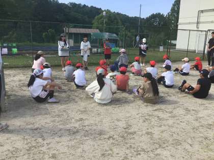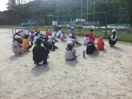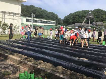 なかよし班でさつまいもの苗挿し会を行いました。6年生の司会のもと、深見さんに苗の植え方を教わりました。班ごとに畝に移動して、苗を植えました。
