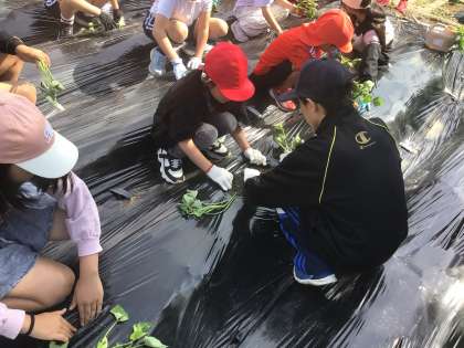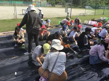 6年生が低学年の子に植え方を教えている班もありました。植えた後は6年生が水やりをしました。深尾さんの「おいしくなぁれって思いを込めて植えるといいですよ」というアドバイス通りに、思いを込めて植えましたね、水やりなどのお世話を全員でがんばって、おいしいお芋に育てましょう。