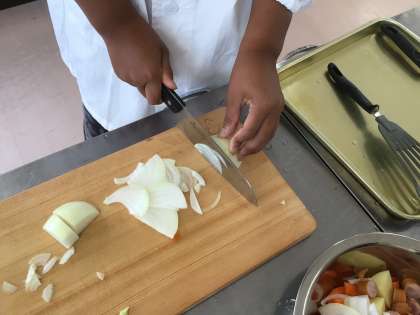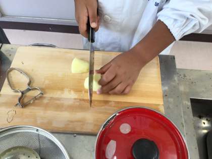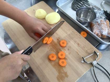 野菜の準備!ていねいに洗って切っています。包丁を持ってちょっと緊張した様子です。