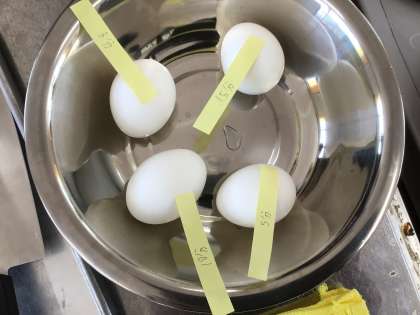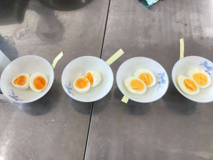 いよいよカレールーが入りました。よい香りです!ゆでたまごは、時間を変えて作りました。どれがお好みでしょうか?