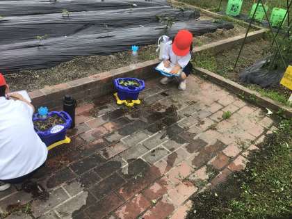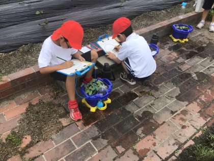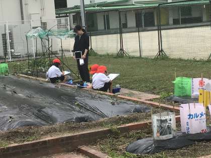 朝顔の観察をしていました。まだ小さいですが、たくさん芽が出ています。水やりのお世話をよくやっているので、すくすく育っていますね。
