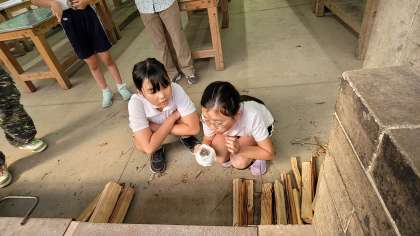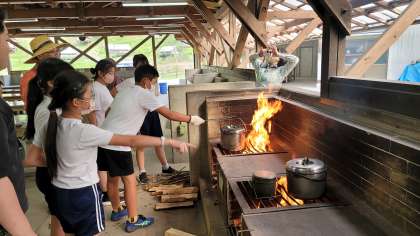 3人で協力して、火起こしを続けて、火が起きたときには歓声が上がりました。すぐにトイレットペーパーに移して、口で風を送りながら、かまどに入れました。カレーの完成はもうすぐです。