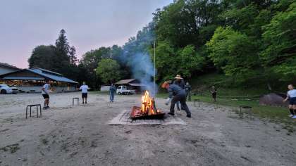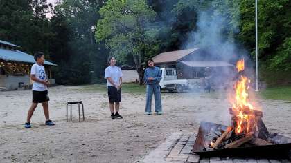 キャンプファイヤーでは、山から火の神を迎えて行いました。班の出し物もダンスあり、ゲームあり、クイズありで、とても楽しかったです。