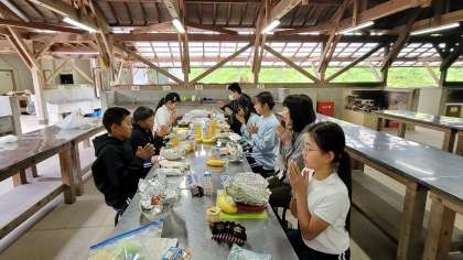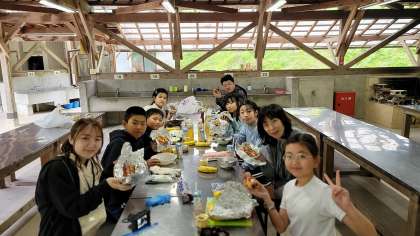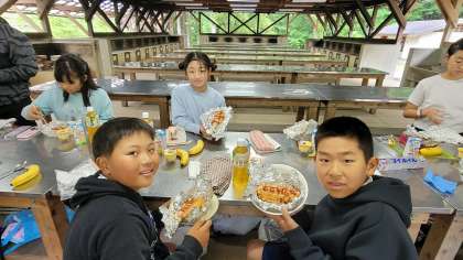 出来上がったカートインドッグを美味しくいただきました。バナナとプリンとジュースもありました。みんな大満足です。