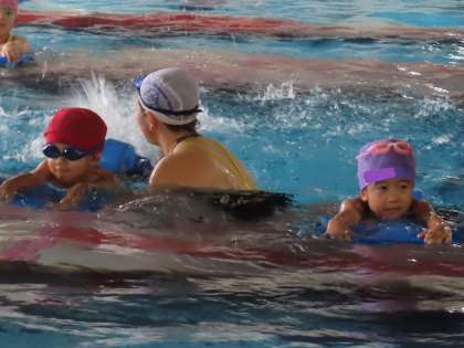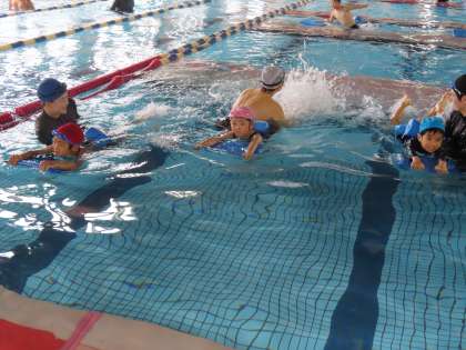 水に顔をつける練習や、バタ足の練習をしました。前回よりも、たくさん水に顔をつけることができていました。鼻や目に水が入ってもがんばりました◎