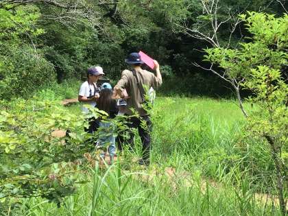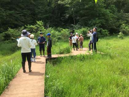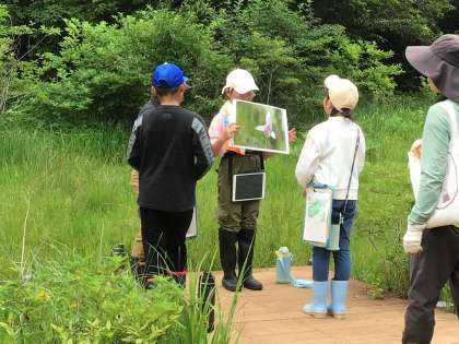 3、4年生が到着し、ガイド本番です。実物が小さくて見づらい、花が咲き終わってしまった植物などは、写真を使って説明しました。クイズを交えての説明に、子どもたちが興味を示しながら聞いていました。