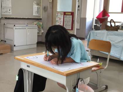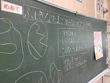 不思議なたまごから何が出てくるかな?「わたしはケロケロケロッピだよ」「ぼくは恐竜だよ」と教えてくれました。色えんぴつやクレヨンを使って、思い思いに表現していました。子どもたちの発想は柔軟でとても面白いですね。
