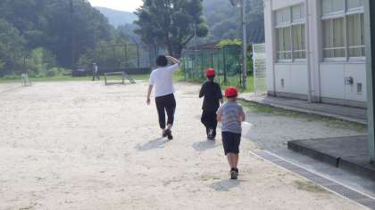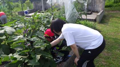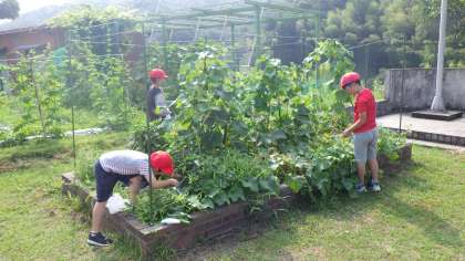 2年生が、登校後に、野菜の収穫をしました。大きなきゅうり見つけて、「おっきいの見つけた!」と大喜びでした。また、なすなど、収穫した野菜を手にいっぱい持ったり、袋に入れたりして、「こんなに取れたよ」と嬉しそうに見せてくれました。