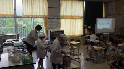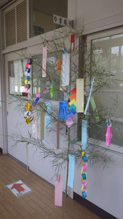 特別支援学級の教室の前に、七夕の願いごとが飾られました。みんなの願いが叶うと良いですね。最近の天気を見ていると、今年の七夕は晴れそうな感じもしますね。2枚目と3枚目の写真は、1年生、2年生の給食の準備の様子です。担任の先生のサポートを受けて、手際よく配膳していました。