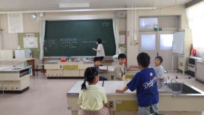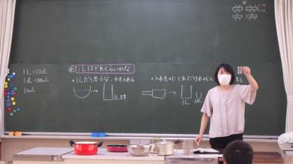今日の算数は、理科室で行いました。フライパンや鍋にはどれだけの水が入るのか予想をして、確かめていました。リットルやデシリットルの授業では、かさがどれだけなのか体験して考えるのが、高学年の体積ににもつながるので、とても良いと思います。家庭でも、お茶やお水など、かさのことを話題にするのも楽しいと思います。