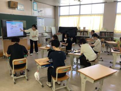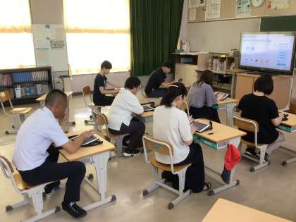 ICT研修を行いました。学習用タブレットに入っているスカイメニューやQubenaに新しい機能が加わりました。研修では、実際に学習用タブレットを操作して使ってみました。9月からの授業に役立てていきます。