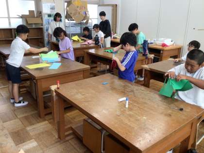 講師の先生を招いて、ポップアップカード作りをしました。カードを開いた時、切り方や貼り方で飛び出し方が変わることを知り、子どもたちはすぐにでも作りたい様子でした。上手く飛び出ない時は、講師の先生からアドバイスをもらいながら作り進めました。