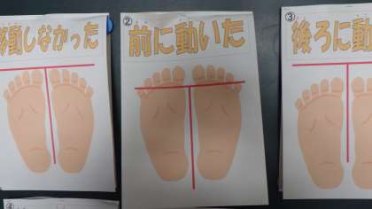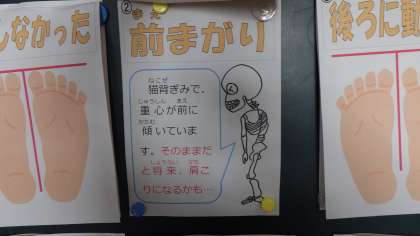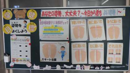 先日、保健委員会が、姿勢を良くする週間を行いました。今、保健室の横に、姿勢に関する掲示物があります。今日、2年生の子が足踏みをしているのを見て、校長先生も、目をつぶって足踏みをしてみました。姿勢が良ければ、30歩足踏みをしても、その場で止まるというものでしたが、終わってみると、残念なことにかなり前に出ていました。