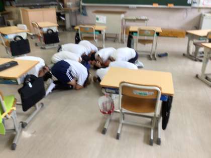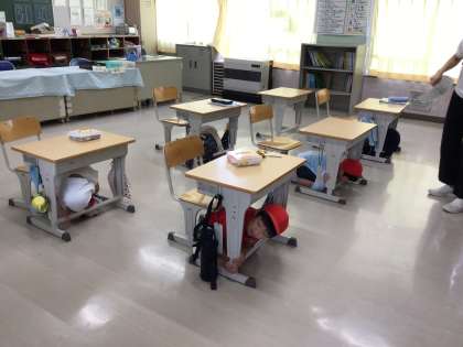 Jアラートが鳴ったときの訓練を行いました。子どもたちに時間は知らせず、放送を聞いて行動する訓練も行いました。外にいる場合は校舎内に入り、初期行動(机の下に入る【正座スタイル】、その場で丸まって頭部を守る【だんごむしスタイル】など)をとります。また、爆風によるガラス飛散から身を守るため、窓とカーテンを閉めます。子どもたちは、落ち着いて行動することができました。