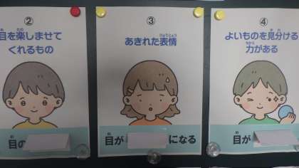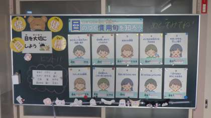 10月に入り、目の愛護デーなど、目を意識して過ごす季節となりました。保健室横の掲示物も一新されました。目の慣用句がいろいろありますが、子どもたちは、どれくらい答えられるかな。また、ご家庭でも、話題にしていただけると幸いです。