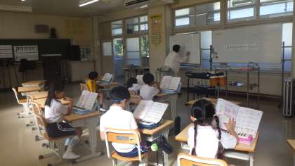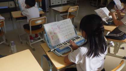 今日の1・2年生の音楽は、鍵盤ハーモニカの練習をしていました。先生のハンドサインで静かにしたり、指示が出たら、元気よく「はい!」と答えて活動している様子が素敵でした。