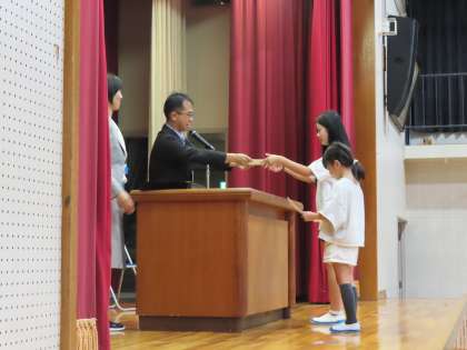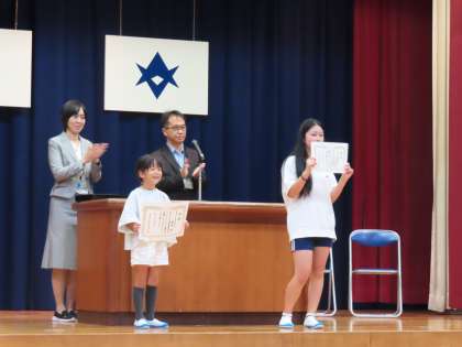 後期始業式の中で、表彰を行いました。豊田市教育研究会から、生活作文・詩、読書感想文の表彰をいただきましたので、披露しました。表彰を受けた児童の皆さんは、おめでとうございました。