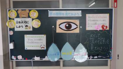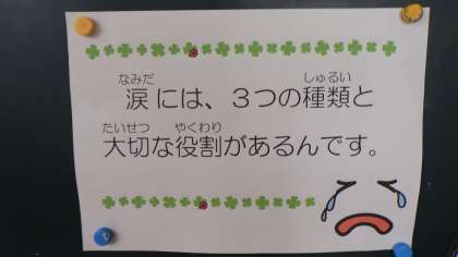 10月も中盤を迎え、目の掲示物がリニューアルしました。涙の種類と役割です。保健の先生が、いつも子どもたちのために、一生懸命工夫してつくっています。本当に勉強になりますね。