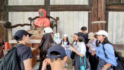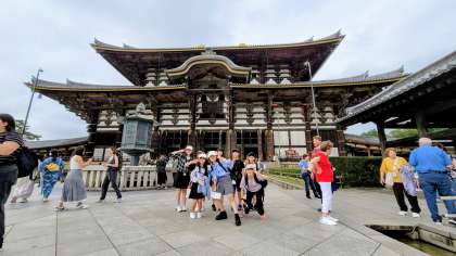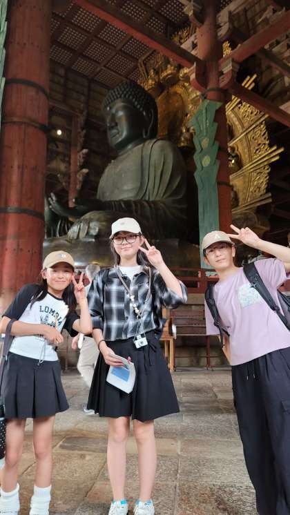 大仏殿に到着しました。大仏殿と中の大仏の大きさに圧倒されました。外のびんずるさんのガイドを子どもたちが行いました。