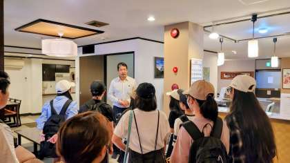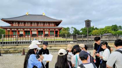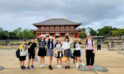 興福寺は、令和4年から令和16年まで五重の塔が修復作業に入っていて、五重の塔は見ることができませんでした。しかし、国宝館に入って、千手観音像を拝むことができました。とても大きくて、迫力がありました。そのあと、中金堂のガイドを行って、記念写真を撮りました。いよいよ宿泊先に到着です。全員、元気よく、あいさつをして、旅館の方のお話も、「はい!」と返事をしながら聞くことができました。とても素敵なやなみっ子たちです。