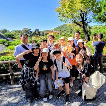 金閣寺に到着しました。たくさんの人で溢れていましたが、みんなに隙間に入り込み、いろいろな角度から写真を撮りました。天気が最高だったので、金閣寺も一段と輝いていました。