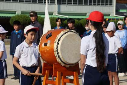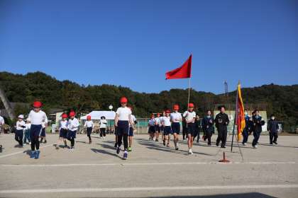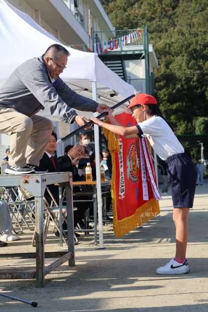 暖かい日になりました。優勝旗返還、選手宣誓を地区の方とともに行いました。ラジオ体操、ゴーゴーゴー、赤白代表の言葉など、きびきびと元気の良い姿を見られました。
