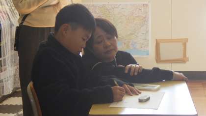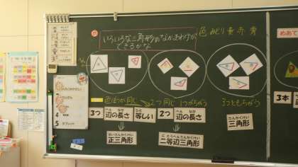 個別最適化学習を行っています。自分で作った三角形を仲間分けする過程で、正三角形、二等辺三角形、三角形の定義を学びました。同じ長さの辺がいくつあるのか、同じ長さの辺がないのか、よく自分で見つけられましたね。