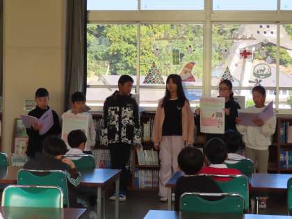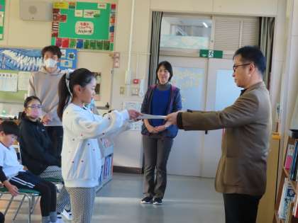 社会福祉協議会から、矢並小学校の福祉活動の取組が認められて、顕彰状をいただきましたので、生活委員長に渡して、全校に披露しました。