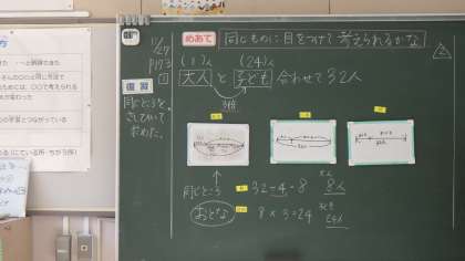 今日は、子ども△人分でいくら、大人〇人分でいくらという2つの条件から、子どもと大人の利用料金を求める問題を考えました。中学校に行くと、方程式を使って求める問題ですが、小学校の考え方でも求められると応用が利きますね。