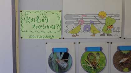 今月は、「むしのこえ」です。秋の代表曲のような歌ですよね。虫の名前を合わせて、クイズ形式で掲示してあります。虫の名前が全部言えるかな。歌を覚えるのと同時に、虫の名前も覚えてみてくださいね。