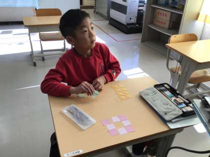 今日から授業を再開した2年生。色紙を並べて図形の学習をしました。直角三角形や長方形、正方形を並べるといろんな形ができました。「家ができた!」「車作ろう!」など、久しぶりの学校はいつも以上に楽しいようで、声が弾んでいました。