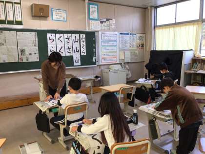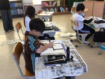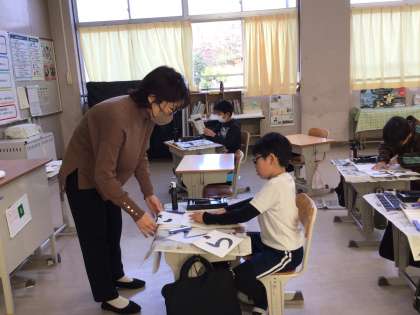 3年生も、書写ボランティアの先生に指導していただきました。みんなの書いた文字を見て、どう書いたら、もっとお手本に近くなるのか考えながら練習しました。