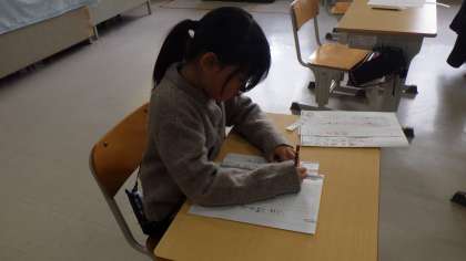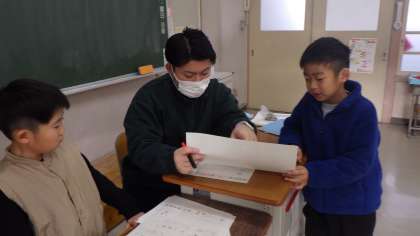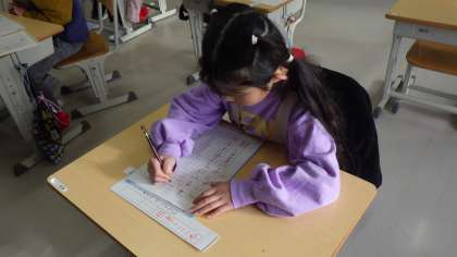 書写の時間に、書き初めの練習をしました。一文字一文字、教科担任の先生から教えてもらって、ていねいに直しながら文字を整えることに取り組みました。2年生も上手になってきましたね。姿勢も気を付けていることがすてきです。