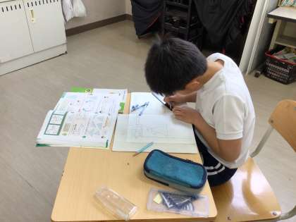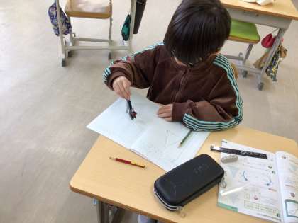 二等辺三角形や正三角形の定義を学習した後、コンパスを使って三角形をかきました。コンパスを使って二等辺三角形や正三角形がかけることに驚きながら、取り組んでいました。上手にかけると嬉しそうでした。
