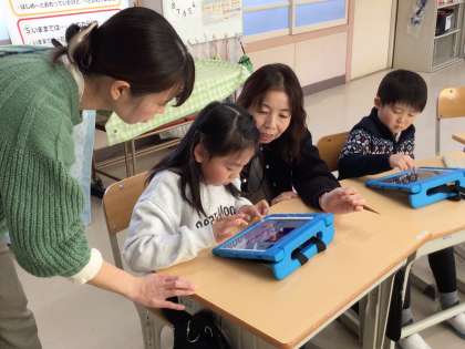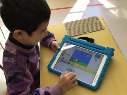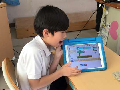 ICT支援員が来校して、「Scratch Jr」を使ったプログラミングの授業を行いました。「射的ゲームを作ろう」をめあてに、敵を増やしたり、敵に当たったら「あたり」のページにとぶようにするなど、教えてもらいながら一人ひとり作りました。