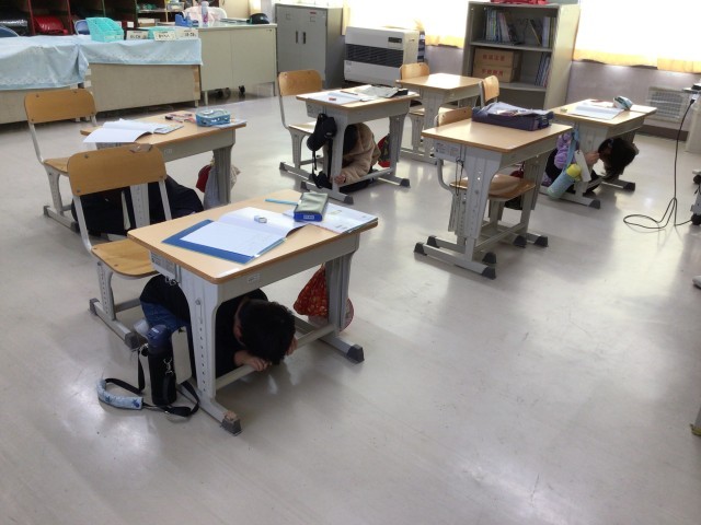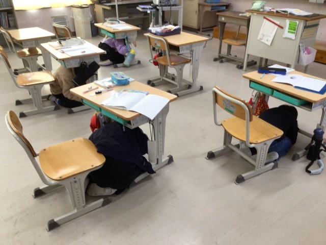 Jアラートの放送が入り、自分の身を守るための初期行動をとりました。学校では、「正座スタイル」と「だんごむしスタイル」を指導しています。からだをできるだけ小さくしてしゃがみ、頭を守ることができました。