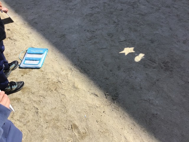 太陽の光について、校庭で鏡を使った実験をしました。鏡ではね返った光はまっすぐ進むことを学び、今日は画用紙で作った形の光ができるかを実験しました。遠くに反射した光は形になりにくく、近くに反射するときれいな形になりました。