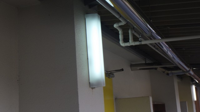 玄関と体育館横2か所、蛍光灯の配電が壊れてしまい、点灯しなくなっていました。そこで、業者に工事を行ってもらい、今日からきちんと点灯するようになりました。