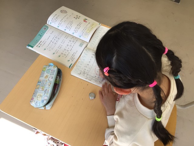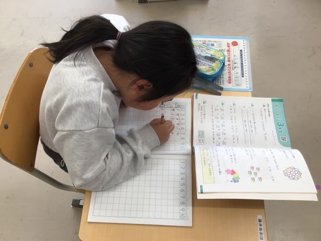 「もうすぐ3年生」の問題を解いていました。2年生で習ったことの復習で、いろいろな単元の問題を思い出しながらがんばっていました。登校日は今日を含めて10日になりました。もうすぐ3年生です!