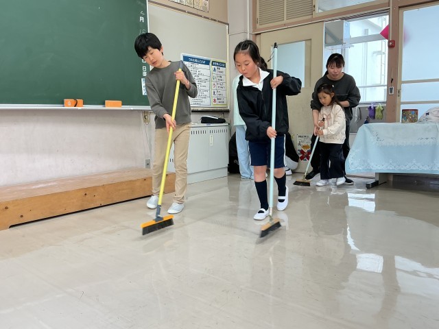 4月15日 清掃活動の様子 公開日 2026/04/15 更新日 2026/04/15 お知らせ 高学年の指示のもと、縦割り班で清掃をしています。昨日確認した方法で、ほうきもぞうきんもていねいに行いきれいになっていました。床は年度末に行ったワックスがけでぴかぴかです。きれいな環境で落ち着いて学習に取り組めるように、これからもt協力して取り組んでいきましょう。