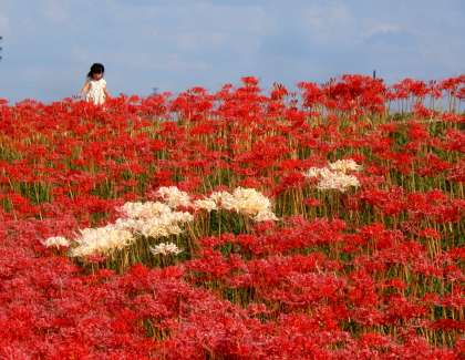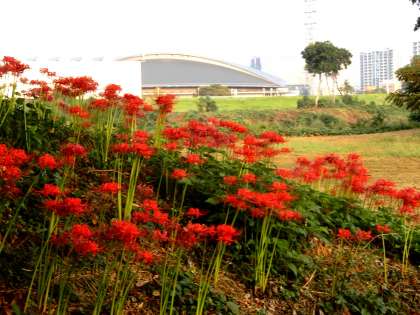 矢作川河川敷のヒガンバナ群落は開花真っ盛り