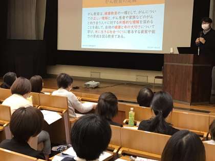 年に1度の養護教諭研修を今年も無事開催することができました。講義1では、がん哲学外来メディカルカフェシャチホコ記念より彦田様をお招きし、実際に講師として伺う学校で伝えられる「がんのお話」と「届いた感想」の紹介をしていただきました。当たり前の日常の大切さに気付かされるとともに、命や健康についてみんなで一緒に考えることの重要性を感じました。講義2では、愛知県がんセンターより緩和ケア部長の下山先生に来ていただき、がんを通して「考えたいこと」とがん教育を行う上で「配慮すること」を教えていただきました。これからも外部講師を活用して、生きることの意味と命の大切さ・価値について考えるきっかけとなるような授業を作っていってほしいと思います。