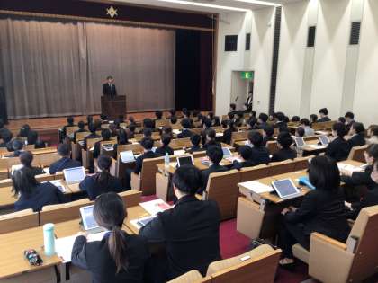 開講行事には、新規採用の教諭・養護教諭・事務職員・栄養教諭が参加し、講話を聞きました。初任者は、真剣な表情でうなずいたりメモを取ったりしながら聴いていました。