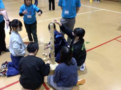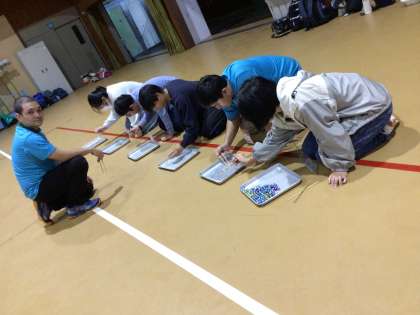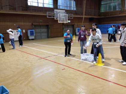 ちびっこギネス。10個の種目に挑戦しています。どのグループも真剣です。英語が飛び交っています。