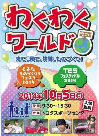 「わくわくワールド」は,ものづくりの町豊田ならではの科学とものづくりのイベントです。豊田市とトヨタ自動車の協賛で開催されるこのイベントは,豊田市保見町スポーツセンターを貸し切っての大イベントです。市内の小中学校全児童生徒にチラシを配布しました。