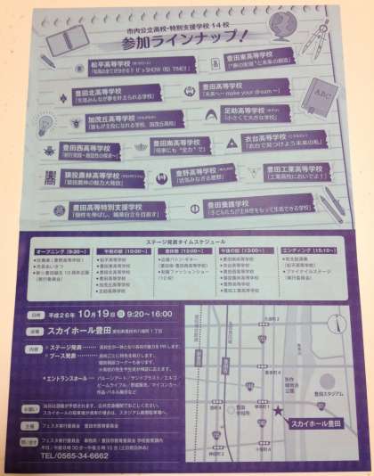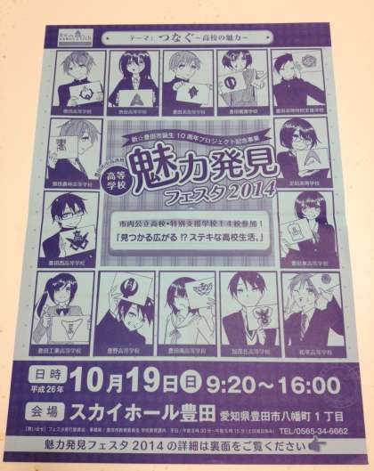 新豊田市誕生10周年プロジェクト記念事業の一環として,高等学校魅力発見フェスタ2014が,スカイホール豊田で開催されます。中学生には写真のようなチラシが配布されています。ぜひお越しください。
