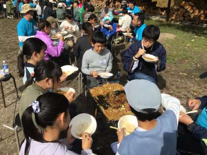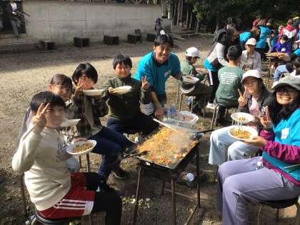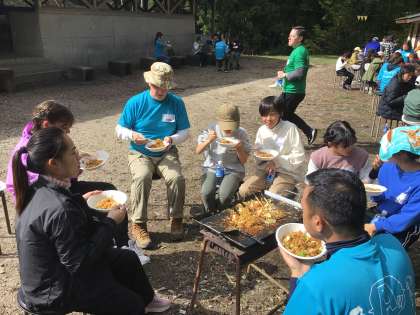 火加減もよい感じ。Cutした食材を炒めます。たくさんの焼きそばができました。みんなでLet'eat!