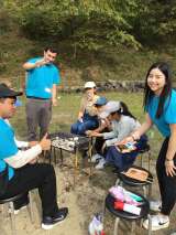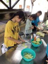 野外炊飯が始まりました。手分けして、焼きそば作りをしています。