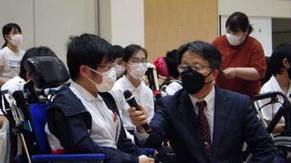 交流会では、ボッチャについてのプレゼンテーションや河本選手との交流試合、インタビューなどを行いました。交流試合では、メダリストのプレーを間近で見ることができ、一つ一つの正確な投球に児童生徒はもちろん職員も感嘆の声をあげていました!インタビューでは、「銀メダルをかけてもらったときはどんな気持ちだったか」という問いに対して、河本選手は「うれしかった。メダルの重さを感じたとともに、大会運営に携わってくれた人や応援してくれた人の頑張りの重さも感じた」と、児童生徒の質問に丁寧に答えていただきました。河本選手の言葉を一字一句聞き逃すまいと真剣な表情で聞いたりメモをしたりする児童生徒の姿も見られました。また、交流会後には、河本さちよ選手から「(河本選手について)ボッチャを始めた当初は、投げたボールはてんでばらばらだった。それでも、あきらめずに考えて、考えて努力してきたから今の彼がある」、藤田教授からは「ボッチャは、教えてはだめ。本人が考えることが大切」などという意義深いお話をしていただきました。
